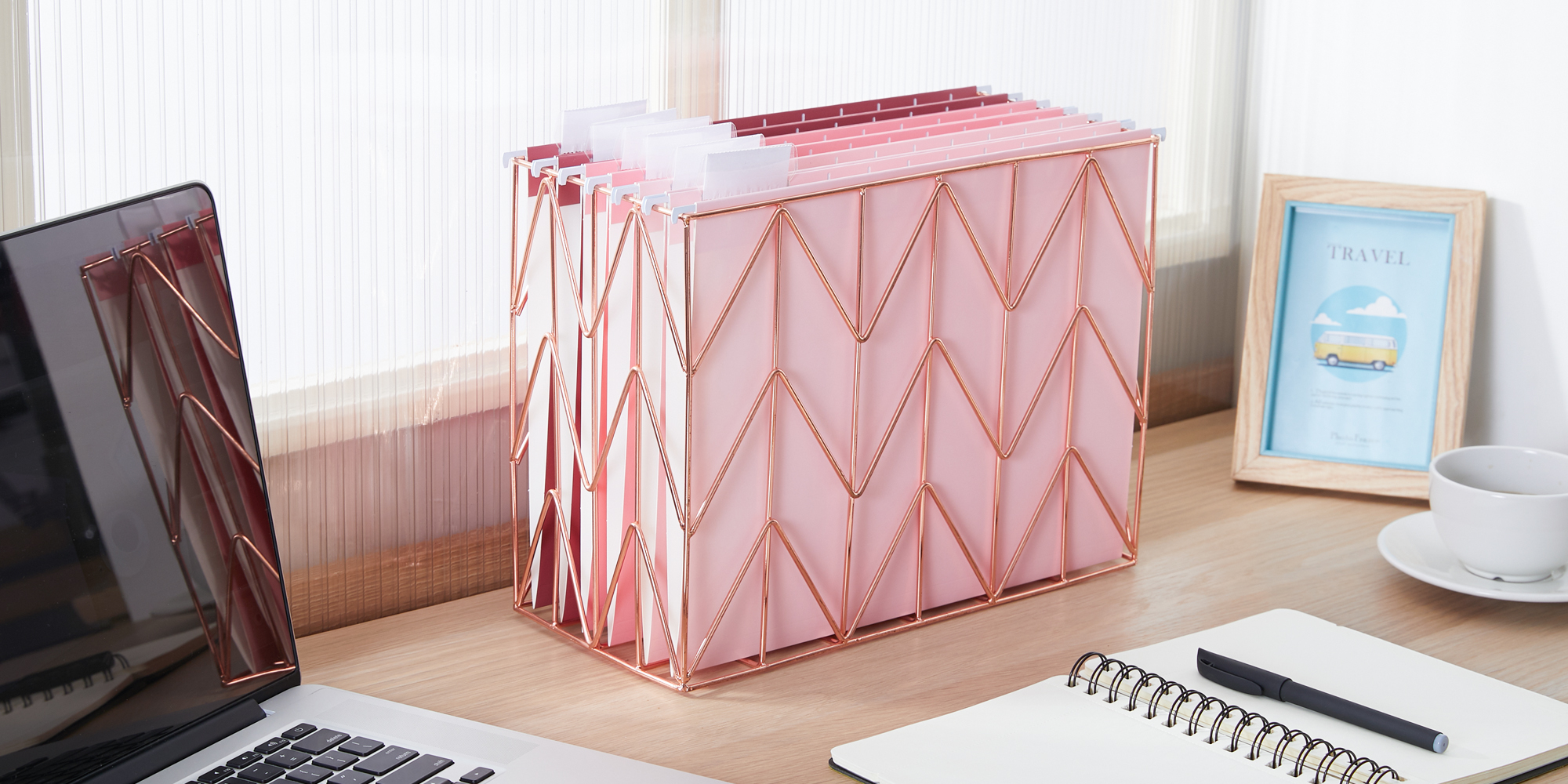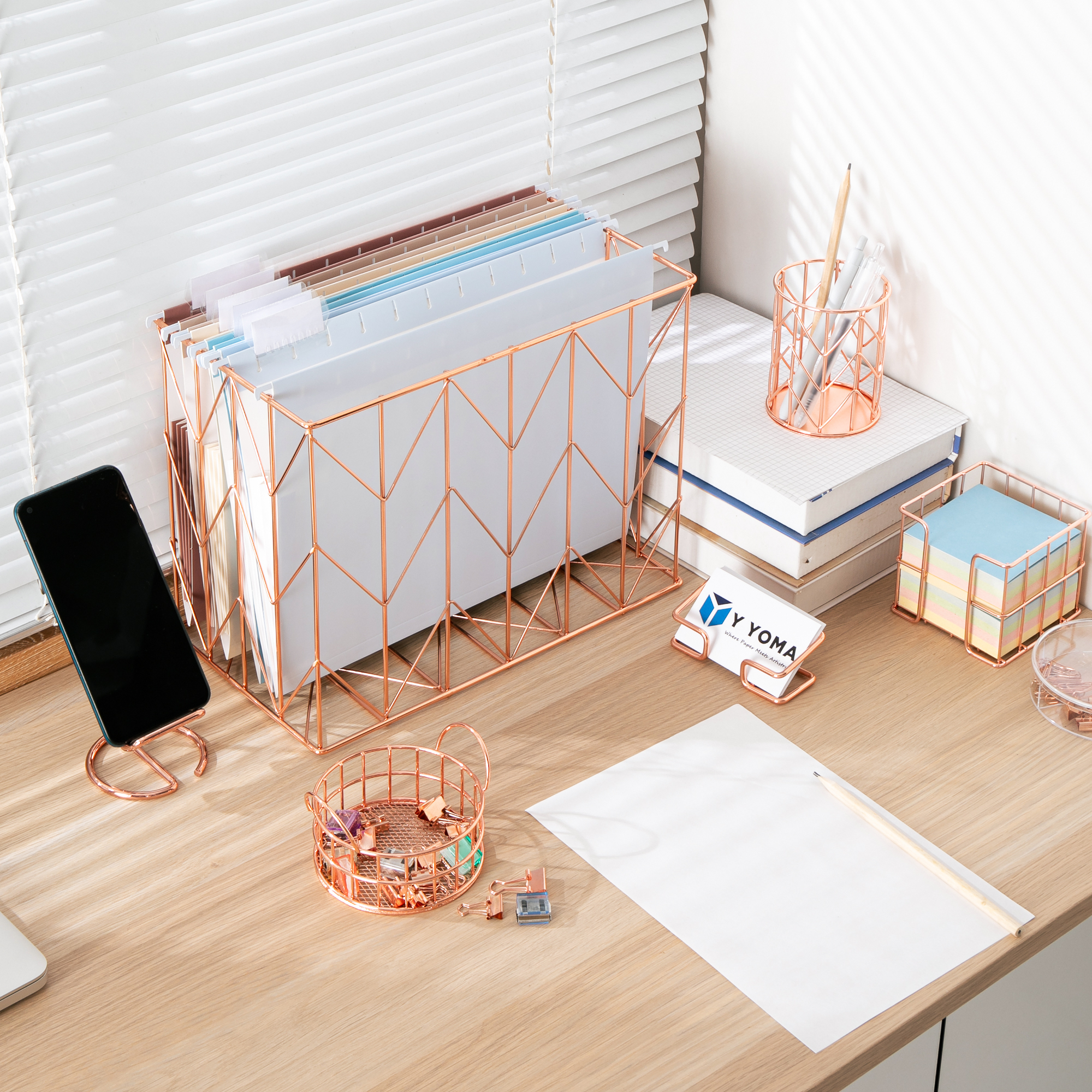 Y YOMA Hanging File Organizer, Letter Size Desk File Crate, Foldable Rose Gold Metal Storage Box for Home Office, 1 Pack