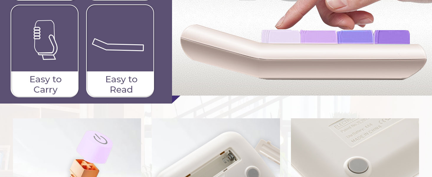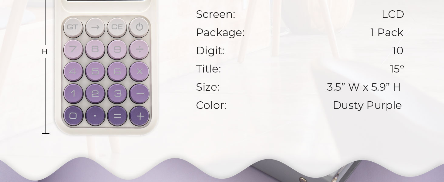 Dimension - 5.9” W x 3.5” H, Dusty Violet. Our desktop calculator operates on AAA batteries(package not included). For further problem, please feel free to contact us via amazon