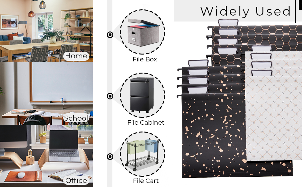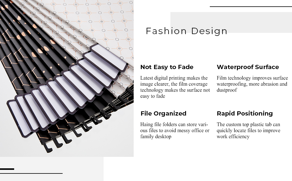 Black Foil Design - Unlike traditional file folder, our black foil of hanging file folder and tabs can match the gold desk organizer, and bring fashion and a modern atmosphere to your desk, create a more luxurious and elegant space