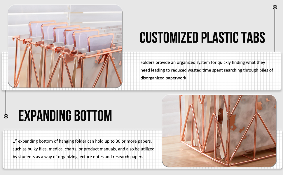Gold Foil Design - Unlike traditional file folder, our rose gold foil of hanging file folder and tabs can match the gold desk organizer, and bring fashion and a modern atmosphere to your desk, create a more luxurious and elegant space