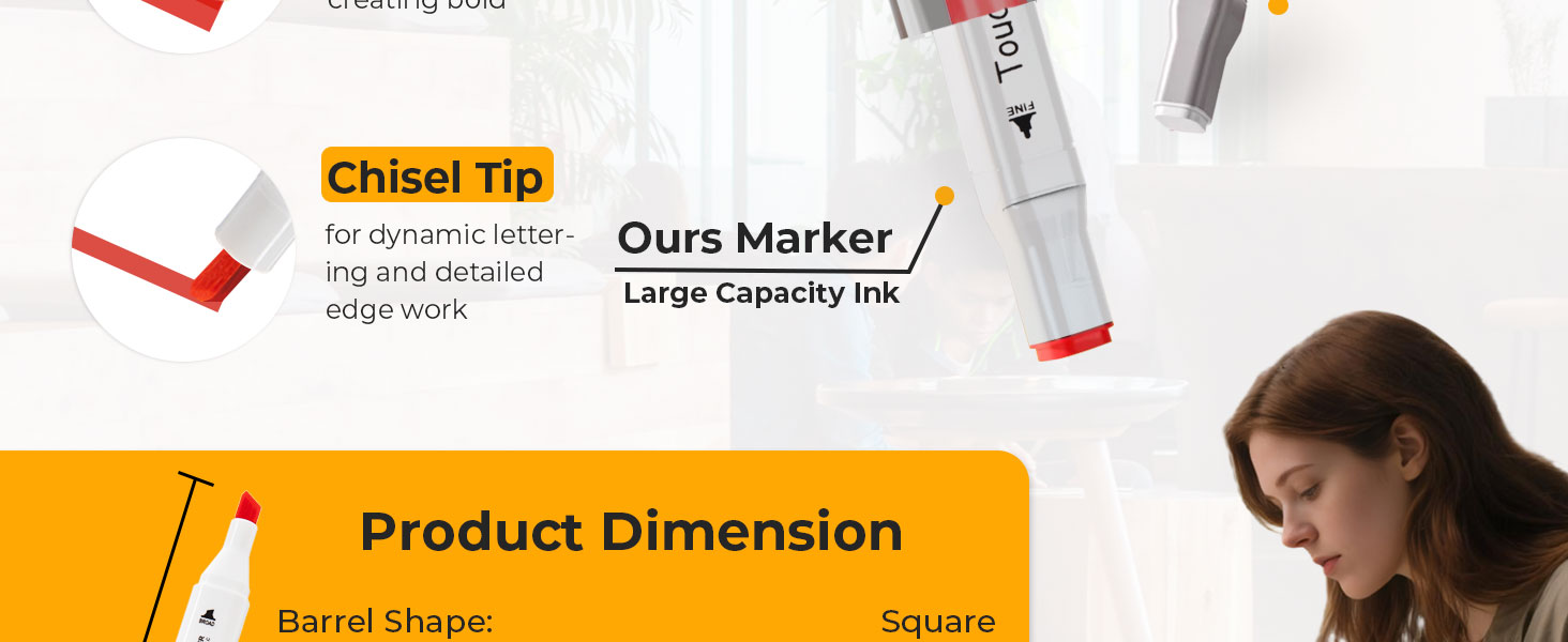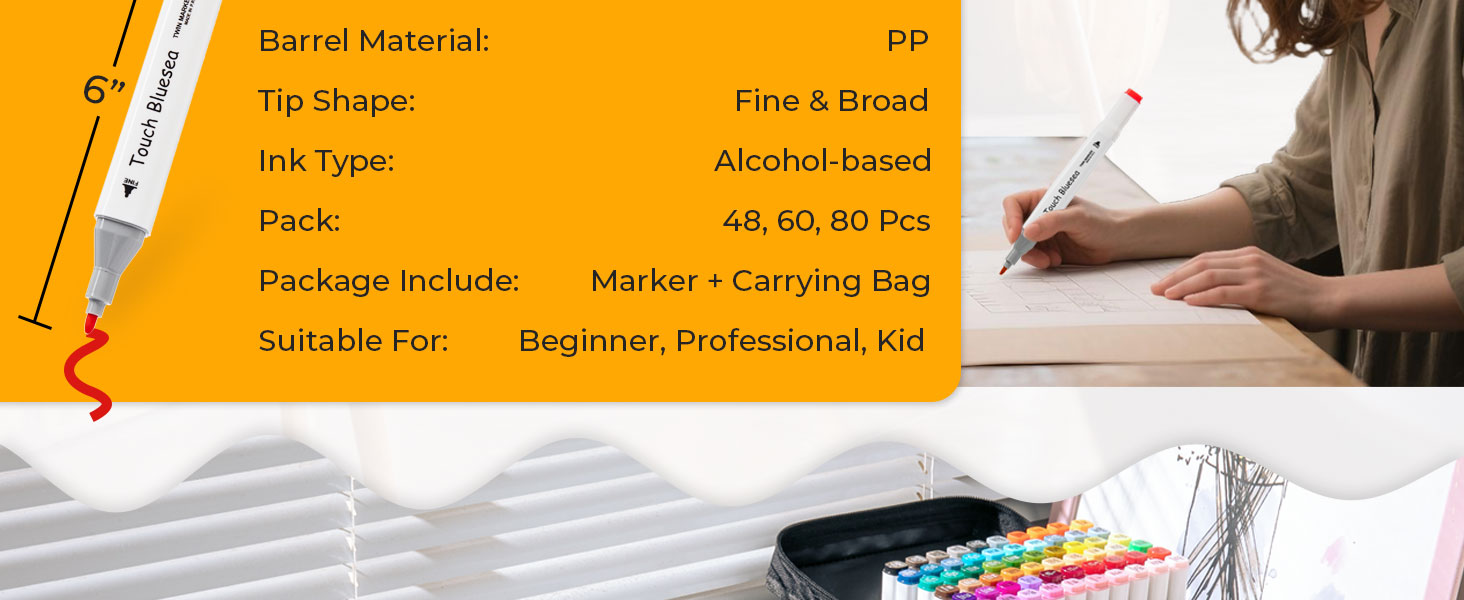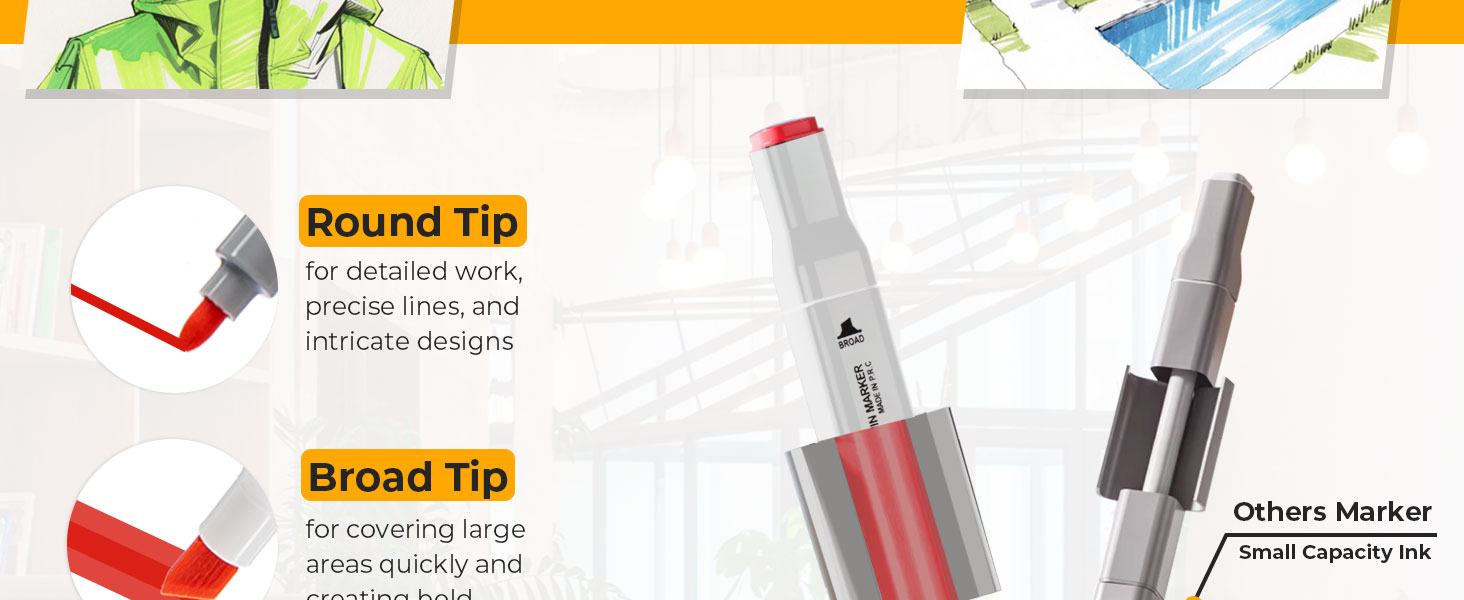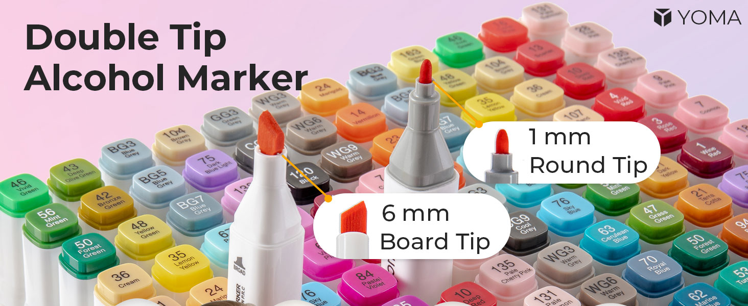 Double Tip - High-density fiber tip of alcohol marker ensure smooth writing. The round tip(1mm) handles fine detail, the broad tip(6mm) covers large area, and the chisel tip(2mm) creates lines of varying width