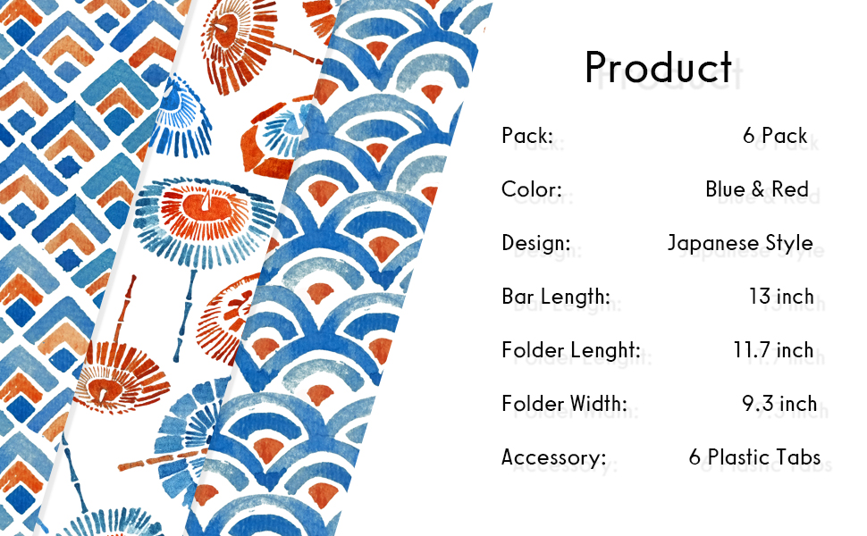 Folder Dimension - Top metal bar's length is 12.75”, file folder size is 11.7" W x 9.3" H. You will receive 6 folders + 6 customized plastic tabs (3 Japanese Style x 2). For further problem, please feel free to contact us