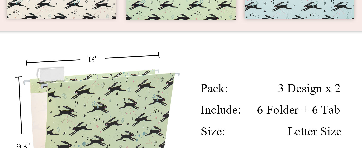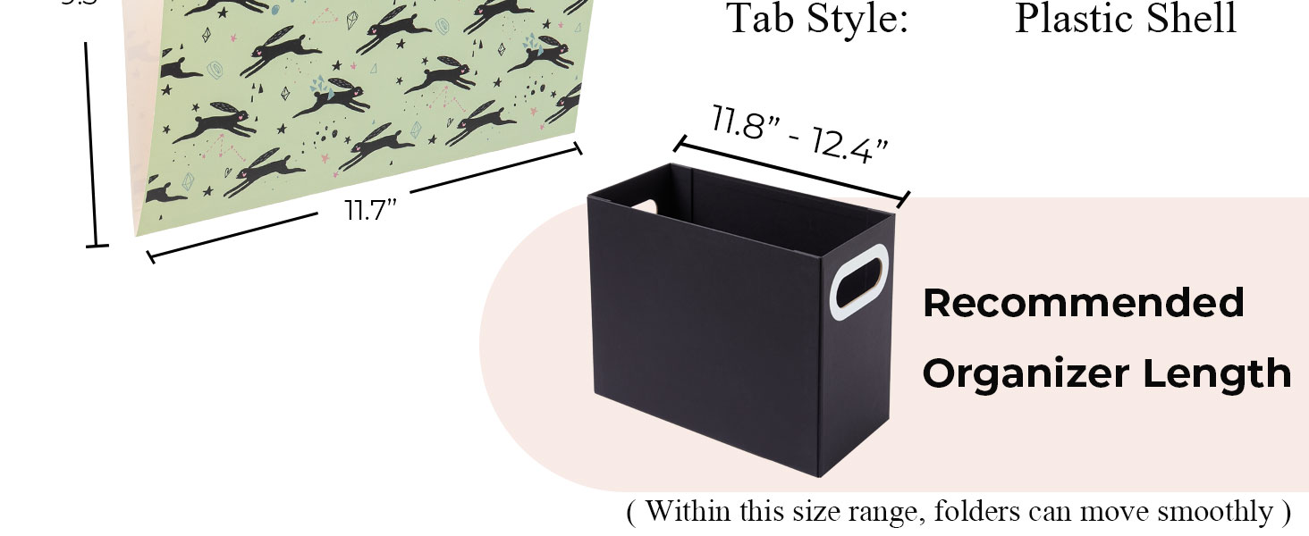 Folder Dimension - Top metal bar's length is 12.75”, file folder size is 11.7" W x 9.3" H. You will receive 6 folders + 6 customized plastic tabs (3 Rabbit Design x 2). For further problem, please feel free to contact us