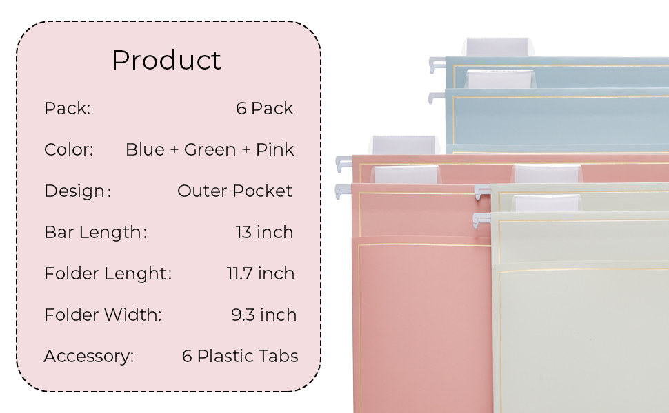 Folder Dimension - Design for letter size paper. Top metal bar's length is 12.75”, file folder size is 11.7" W x 9.3" H. You will receive 6 folders + 6 customized tabs (3 Gold Foil Design x 2). For any accessory lost, please free to contact us