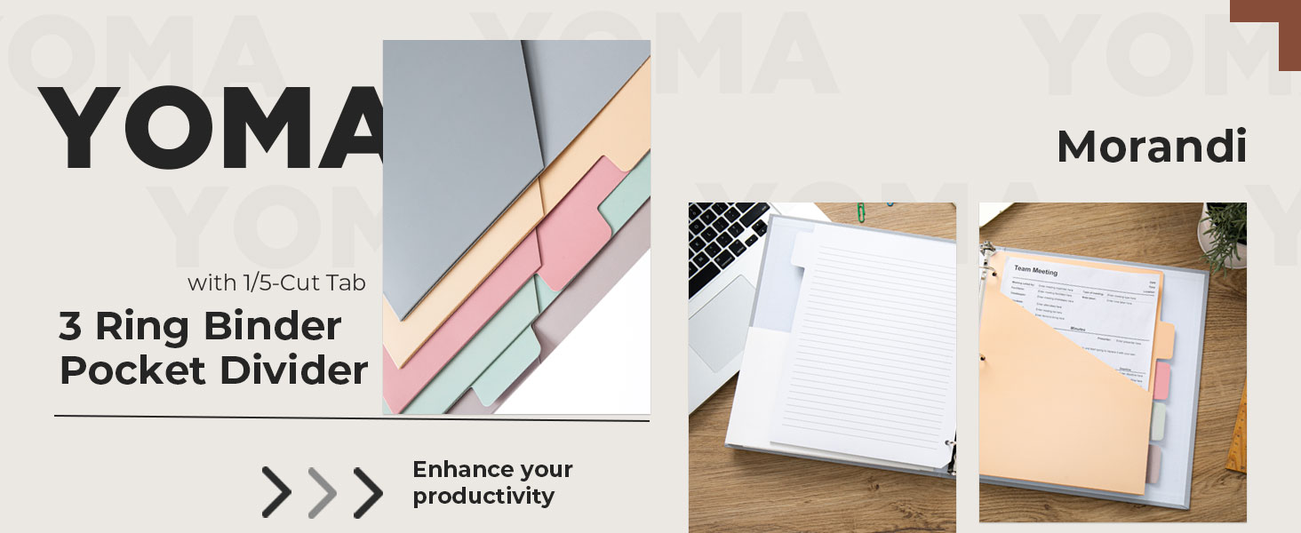 Y YOMA Colored 3 Ring Binder Dividers with Pocket Letter Size Paper Binder Tabs Page Dividers Cute Decorative Binder Index Dividers for Office School Home with 1/5-Cut Tabs, Morandi Color(5 Sheet)