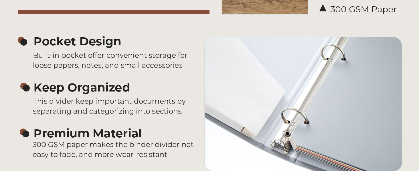 Pocket Design - Each binder divider feature a bulit-in pocket. These versatile dividers not only help you categorize your documents but also offer convenient storage for loose papers, notes, and small accessories