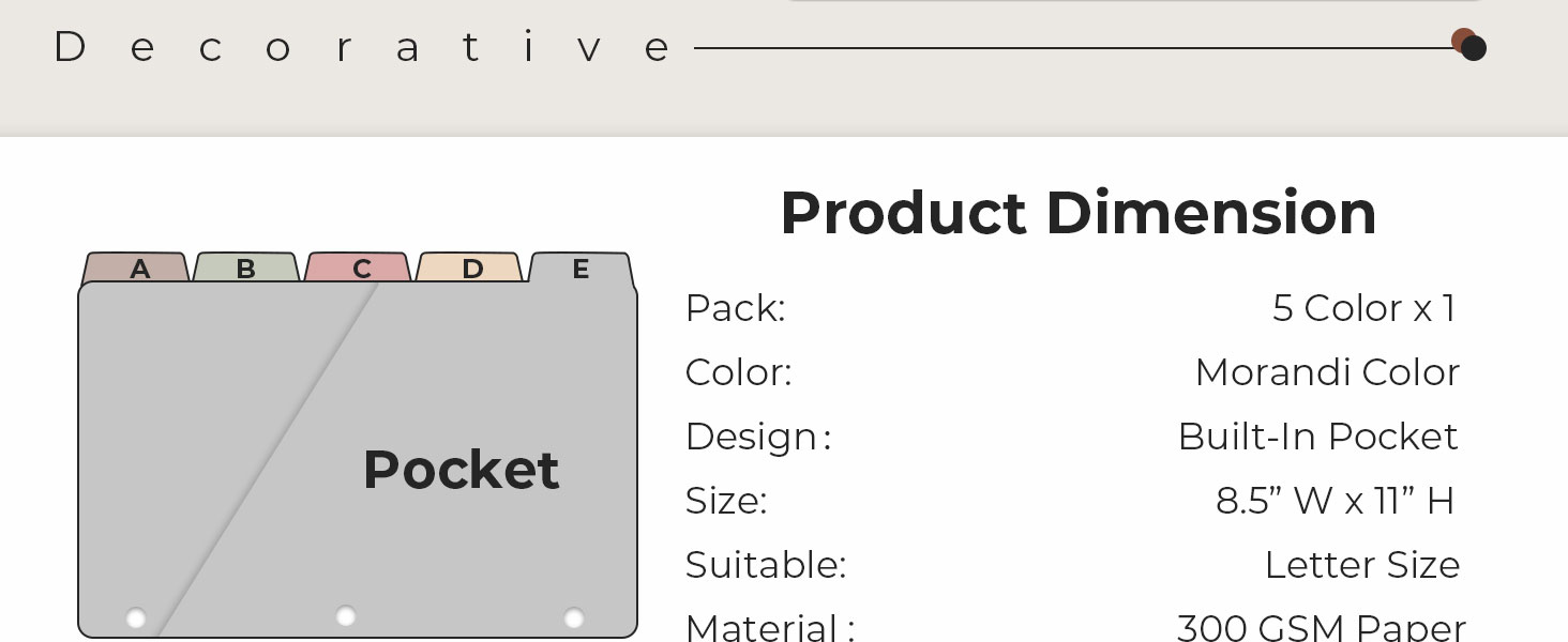 Divider Dimension - 8.5” W x 11” H, are designed for letter size paper. You will receive 5 pocket binder divider with 1/5-cut tab each (5 Morandi Color x 1). For further problems, please feel free to contact us