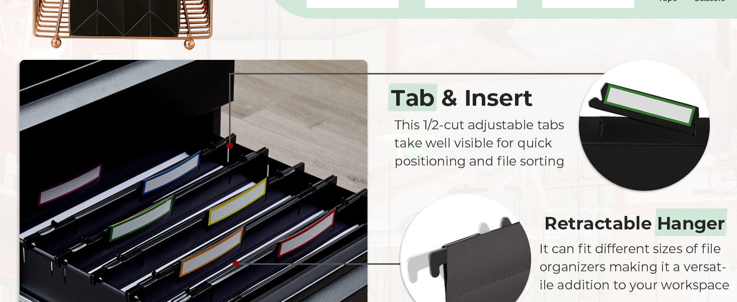Universal Fit - This file organizer folder fits letter-size papers and works with most standard file cabinets. Its retractable hooks adjust easily to fit different sizes of file organizers making it a versatile addition to your workspace